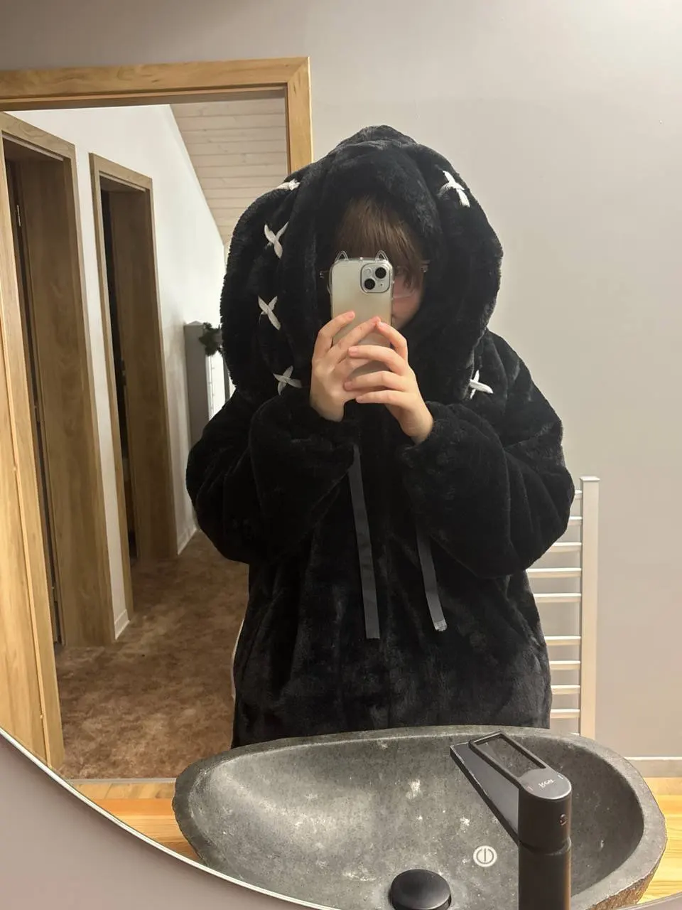 Soft, dark, and impossible to ignore, this oversized black bunny hoodie is made for girls who live in their villain arc but still want to stay warm. Crafted with ultra-plush faux fur and stitched with bold X-marks on the ears, it's the ultimate cozy piece for any alt or Y2K streetwear wardrobe.